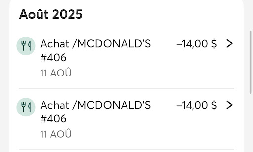 Read moreJ’utilise l’application pratiquement à chaque fois que j’ai le goût de manger du Mc-Donald’s, cette fois-ci j’ai utilisé l’offre 2 trio pour 18$. Ma conjointe a demandé un Mac poulet avec extra fromage-bacon. Elle a reçu bacon tomate comme vous pouvez remarquer. De mon côté j’ai commandé un Big-Mac, sans laitue, extra cornichon. J’ai reçu un Mac-Poulet.