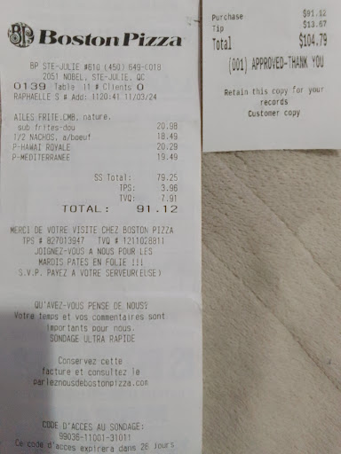 Read moreJe ne retournerai jamais chez BP Ste-julie et je déconseille fortement a tous. Serveuse trop jeune et manque d'experience. Aussitôt dans une problématique, cours voir la gérante pour la démarche à suivre, n'a aucune initiative mise à part une ligne de conduite dictée par la direction. Arrogante et nonchalante, n'aide aucunement sa clientèle a faire des choix quant à la sélection des accompagnement en répondant "on vous donne un menu, c'est à vous de nous dire ce que vous voulez". Aucune info ni explication sur la promo "les enfants mangent gratuitement". Elles nous laissent choisir des plats n'en faisant pas parti et ne nous avise pas et le charge sur la facture au final. Réponse défensive et évasive. Plusieurs erreurs dans les plats servis et dans la facturation. Apres 1h10 assis, nous n'avions toujours pas notre repas sur la table. Elles ont grandement besoin de formation professionelle. Quand je vais au resto, je ne veux pas me sentir comme si j'étais dans une école secondaire. Je ne livrerai plus jamais pour ce resto egalement car si vous vous demandé pourquoi votre commande arrive tard, c'est parce que la cuisine c'est pas mieux. Pas vite et beaucoup d'oubli. Nous, livreur, pouvons attendre des fois 30 minutes et plus avant de quitter avec votre commande. J'ai essayé de faire accélérer vos commandes en chialant un peu mais ils m'ont bloqué sur l'appareil alors je ne peux plus livré pour eux. Mes soupcons d'incompétence et de je m'en foutisme se sont confirmé lors de ma visite en restaurant. S'il y avait l'option 0 etoile, c'est ce que je vous aurais donné. Et elle ne méritais surtout pas le pourboire de la part de la personne qui m'accompagnait. Vous avez un bon bout à faire quant à l'amélioration de...