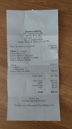 Read moreWow. I have worked in a ACTUAL authentic Mexican restaurant. This WAS NOT anything comparable eventhou the owners state that it is. Was very excited to eat here on our way passing thru to Alberta. Wow who ever the chef is please take this review with humility. First off,, my husband's strawberry margarita was soo NOT flavorful. Could only barely taste the strawberry. For 10$ honestly put some fresh strawberrys in it. 2nd,, was looking forward to the mole enchiladas. OMG the mole sauce tasted like WATER!!. No flavour, bland bland bland..where is the depth of flovour the layering of spices ??????. it WAS NOT authentic mole sauce. Not even in the least. Even the sour cream was watery and feta cheese was sparce . Honestly do you want the customers of Salmon Arm thinking this is how a true mole sauce tastes??? The enchiladas came luke warm at best. The chicken you could tell was dry and had probably been cooked days before. Or maybe it was brought in already cooked like what you get at a fast food place. Nice touch for the free chips ans Pico but once again. Chips were cold. The Pico had no flavor what so ever. Needed more lime more salt more cilantro more jalapeno. Because I KNOW authentic handmade Mexican I would hate for other patrons to think this is the way it should be made. I don't know if this restaurant is failing and have to stretch the dollar but PLEASE stop serving this garbage with a front being that it's even good. Sorry not sorry. Guacamole? Huh?? needed so much love it was sad. Rice? ?? Cold and knew it was from days and days old. I know mexican food / ingredients are relatively cheap.. Step up man!! The food you are serving is so UNFLAVORED. There is no love going into your dishes. I will say the only saving grace was our sweet sweet waitres. She was so sorry and i hope she goes to a much better restaurant cause she...