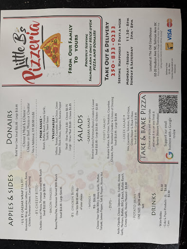 The pizza was awesome. I thoroughly enjoyed it. The only downside is it's takeout and there's no in house dining. The establishment is in the basement of the old Salmon Arm courthouse, with the entrance on the east side of the building. You won't find it if you enter the main doors to the various businesses. You'll sure smell the delicious aroma wafting through the building. There are 3 tables outside, with 2 chairs at each table located near the entrance. If it's a nice day and you'd like to eat outside, they will bring your pizza out to you in a takeaway box with some napkins and wet wipes. No plates, no utensils. My advice to you is pre-order before you arrive. I arrived at a busy time and waited outside for 25 minutes till my order was ready. Meanwhile I watched good folks coming and going, all picking up their orders. Then mine finally arrived abd folks it was worth the wait. Mmmm yummy soooooo good. Thanks little B's. I'll be back again next time I'm through...