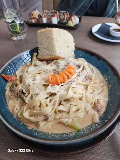 For appetizers we ordered red curry shrimp and a pound of mussels. Both dishes came out promptly and came with a large piece of warm bread. The bread was odd. It had the consitency of very loose cornbread and did not serve its intened purpose of sopping up a delicious sauce. The shrimp arrived in a bowl that was baked over with what appeared to be marbled cheddar - an odd choice for red curry shrimp. The sauce tasted good ut was watery rather than creamy. The mussels were ok but several did not open or had been crushed. Whoever was at the pass did not check quality. For mains, my wife ordered sushi which appeared well prepared and tasted good. I am not a big fan of non-Japanese restaurants doing sushi but I realize it is a common trend. I ordered the brisket and Fettucine pasta which peaked my interest and ended up to be the catalyst for this less than stellar review. It was a utter mess which failed on presentation, flavour, mouth-feel and overall execution. The closest experience I can compare this dish to is A wet cotton mop dipped in a watery alfredo sauce with, again, the same large piece of bread mentioned earlier. The pasta came with the brisket stirred into the pasta which gave it a grey and unappetizing appearance. The brisket fibres pulled together in a hairclog type of mess. I had two bites and the mouth-feel is exactly as one would imagined. I sent it back. I suppose what I had imagined in my culinary mind was a small pile of brisket piled atop of some Fettucini pasta. If I was asked, I would do smoked brisket but that is neither here or there.