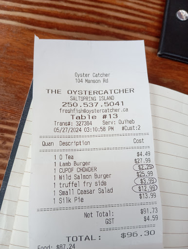 Further compounding this issue was the lack of proactive resolution from our waiter upon bringing the matter to their attention. In light of this experience, I urge fellow diners to exercise diligence and attentiveness when settling their bills, thereby safeguarding against inadvertent discrepancies. While the Oystercatcher Bar and Grill offers a pleasant dining environment and a tantalizing menu, the issue of pricing transparency warrants consideration and vigilance on the part of patrons. Overall, my experience at the Oystercatcher Bar and Grill was tempered by this discrepancy, serving as a reminder of the importance of conscientiousness in all aspects of the dining experience. Would I recommend this restaurant to others? Proceed with caution and ensure meticulous scrutiny of your final bill. The final bill was 96.30$ for 2 burgers and a tea, the sides were charged extra. On the photos show the price in menu different...