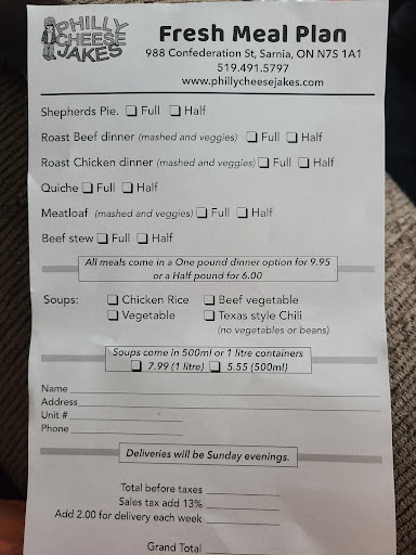 I've been getting food from Jake for years. He has a small menu of his usual offerings, but if you have a craving for anything he can whip it up. His potato salad and homemade caeser dressing are out of this world. The picture I have included is one of his family meal deals I got with penne pasta, large garlic bread, caeser salad ( with the amazing dressing, homemade croutons and real bacon) and minestrone soup. His prices are great for the amount of food you receive. If you haven't tried Philly Cheese Jakes yet, what are you waiting for? You won't be...