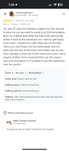 Read moreI was abit disappointed with our visit to this A&W. We pre-ordered from their app, and really appreciated the offers that were available, but the good ended there. When I arrived, and went to the mobile pickup line as the app instructed, the server had not yet seen my order, or of course, put my order in. Then instead of putting the order in, she placed a order from the tablet for another customer that was not there, and then put my order in. When I got my order, the onion rings that are what I visit this franchise for, were very burnt, and tasteless. I did not have time to ask for another order. Before leaving, I was going to use the men's facilities, but it was out of order. I certainly will go back to this A&W to give it another opportunity to redeem themselves, and...