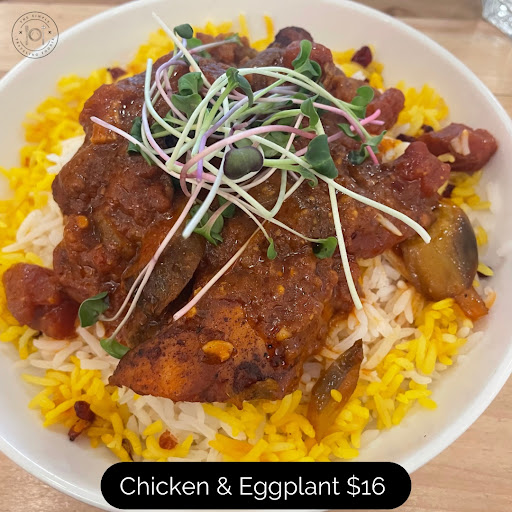I got the Chicken & Eggplant (khoresh badenjan). It’s braised chicken and roasted eggplant in tomato sauce on a bed of rice 🍚 the chicken was oh so tender and eggplants were so soft 🤤 the tomato sauce had a hint of spice that I can’t quite put my words to describe it! All that on rice made it the perfect meal for me 😋 I devoured as much as I could with some leftover (the sprouts mainly - not a fan of those 🤫).