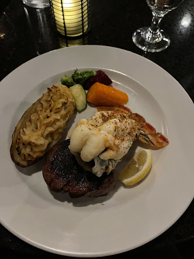 Read moreI was unfortunately underwhelmed. I like to dive into local cuisine with a higher end steak restaurant in places I travel. This restaurant was recommended by my hotel and traveling as often as I do I rely on local’s recommendations. The cocktails I ordered were “Pretty In Pink” and “Berry Basil Bliss”. Both were full of well intertwined flavours. They did not disappoint. The stuffed crab mushroom caps were very tasty but, had minimal traces of crab. The steak was prepared as requested and lightly seasoned. It could’ve been taken to a higher level if it were served on a warmed plate or hot stone. Particularly when served with lobster, it’s preferable to maintain ideal meal temperature with a warmed plate. This way the customer doesn’t feel rushed to eat while it’s warm. The lobster tail was tender however, it lacked any flavour good or bad. The accompanying melted butter was kept warm by lit flame but, was oddly watery in both texture and taste leaving the lobster a sad side rather then formidable pairing. Finally the dessert was a raspberry and vanilla cheesecake. This was perhaps the most disappointing. It was absolutely no better then the cheap, whipped, no-bake cheesecakes that are commonly served at all you can eat buffets. Also, it was a tiny portion given the low quality with high cost. The positives were the atmosphere and the staff. Staff were professional and had formal serving etiquette. They elevate the dining experience which, is needed given the...
