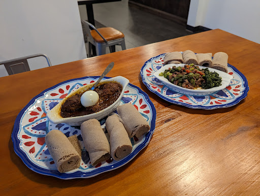 We ordered two dishes: okra with beef and dorho. These two dishes had distinctive flavours and completed each other well. They came with a generous portion of injera (spongy flatbread) and were served on beautiful plates. The lady who served us (presumably the owner) came over to ask us how we liked the food, which was a nice touch. I could sense that she was proud of it. I also briefly chatted with an Eritrian guy at the restaurant after dinner and he was very nice as well. However, the restaurant didn't offer free water...Only bottled water for sale, which was not the best part.