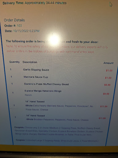 Read moreI'd give zero stars if I could... Ordered a pizza with extra cheese to take home about forty minutes out of the city... Got home, open it up and there was barely any sauce on the thing and they're definitely wasn't extra cheese. So I called them and the manager got on and said he remembered that exact pizza and he made it very , very well for me...lol It was very, very bad and then.He said that I couldn't even get credit for it even though there's a Domino's guarantee right on the front of the damn box staring you in the face when you open it up... He said I would only get a free pizza if I brought the old one back and I told him I'm not driving back into the city wasting 2 hours of my time... It's absolute BS!! Here's an idea... just make the pizza how I ordered it it's like these guys running the place are just making up their own rules and disregarding What Domino's has in place...These guys make domino's pizza look very very bad. And I've had the exact same pizza at other locations and it was great. DONT ORDER...