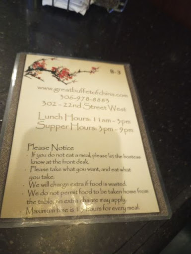 Overall, wasnât the best experience for dinner during my visit to Saskatoon. Main point: the food was very basic, simple Chinese buffet style and very dry. Wasnât worth it to me, Iâd rather spend slightly more for better. But if youâre going to come, I recommend around lunch or maybe try the Sunday brunch buffet. Cheaper and probably more fresh, since they donât replenish their...