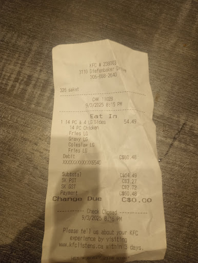 Read moreI normally don't write about places but this place has got to be the worst establishment I've dealt with numerous times! I don't mind them forgetting straws and forks every now and then, but when they screw your order up repeatedly that's where I get a little mad, and tonight was the worst yet! The only thing they didn't wreck was the macaroni salad! Thank god they don't make it there! My big crunch had so much spicy mayo on it to cover up the old dried out chicken that they used in it and the poutine was the same, and I asked for extra sauce for the large popcorn chicken and they would only give me one extra, this place has turned into a joke and you won't be getting anymore service from me! I wish I didn't have to give a star to write a review on here because they do not even deserve that! I would be ashamed to be the owner of this olace and see all the bad reviews and customers that you have lost due to poor managment and some poor employees! I'm sorry for the employees that are doing their best they should not be put in the same basket as the rest! Don't waste your time with this place, you will be very...