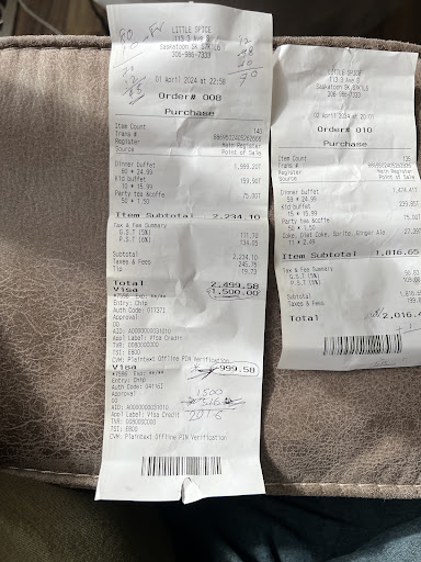 I dined in for dinner on February 1st with a group of 12. I called the day before and booked a reservation, which they told me they would be able to accommodate. I get there and there was nothing set up for us. Given that we were a bigger group, I was expecting to see tables pushed together to make one big table or something like that. There was only one person manning the front and there were 6-8 other customers present at that time. When I tell the person that I have a reservation, it appeared she was surprised and wasnât aware that there was a reservation placed. She asked me if I wanted the set up to be arranged for one long table or two separate tables, I requested for one long table. She seemed visibly unpleased with my response and then asked me which of the three rows would I like, I asked for the middle. Again, visibly unpleased and was dragging her feet on the matter. If you donât want me to take the middle row, why would you ask me that question and give me the option of picking? Couldâve been avoided had the table already been set up for us rather than us waiting a good ten minutes for it to be done right in front of us. The rest of my group came and we all got seated. I had family visiting from out of town and was very excited for this dinner. Once we finally sat down, we noticed that one of the tables was incredible wobbly and saw that there were several gaps in between the ends of the table legs and the floor. We asked the lady if she had anything small to fit under the gaps. She gave us one little folded up piece of cardboard to fit in one gap and the table was still wobbly. We asked for something to fill in the other gaps because we didnât really want to have to through the hassle of changing out the table. Instead of trying to fix the problem, she suggested that we hold the table in place as we eat! We were baffled by her suggestion and refused to do so. Ultimately, she decided to change out the table for us. Finally when it was time to eat (we went with the dinner buffet), most of the stations were either empty or on the verge of being finished. Service in the kitchen was slow in replenishing the food. The food was decent tasting, Iâve had better but this wasnât the worst. No one went back for seconds though and everyone left with half empty stomachs, which was disappointing. The only dessert options were gajar halwa and browned fruits, so that was a great sight. It ended up being a frustrating time for me because I wanted to take my family to great restaurant in Saskatoon. If you were not able to accommodate this big group, you shouldâve let me know. You had my number, you couldâve called me at any point before our reservation to let me know that. I couldâve been spared the disappointment and gone with a different option. The service overall was abysmal. There were no efforts in checking in on customers to see how theyâre doing, nothing done to clear up piling dishes on the dining tables. I had to go up to the lady and ask her to take away the dirty plates. When I went over to her counter, she was on her phone with her feet kicked up. Overall it was appalling behaviour and service we experienced that night. The only good thing that happened was that she gave us the two pops we ordered free of charge. It was an extremely disappointing experience, but we still left a tip. Maybe it was a bad night for the staff, but it left a bad enough taste for me to not go back. Hope future diners have a better time than my...