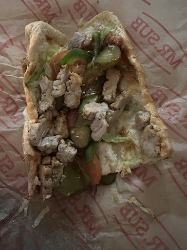 Read moreDisappointed in how stingy they’ve gotten with the toppings. I ordered a Louisiana chicken sub with extra peppers, extra pickles, lettuce, tomato. There was a pretty regular amount of pickles (which I paid extra for) and peppers, almost no lettuce, and very sparse thin tomatoes. Just because I asked for extra pickles and peppers (a quantity that I didn’t even get) doesn’t mean I want next to none of the other toppings. They are also often stingy with the Louisiana chicken sauce which I don’t understand because when you order online it gives you the option of 4 sauces, but won’t let you choose one sauce twice?? What a bummer… would have honestly given it one star but I do like the Louisiana chicken sub, and I like that MR Sub never got rid of this one so two stars...