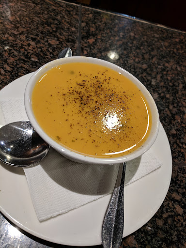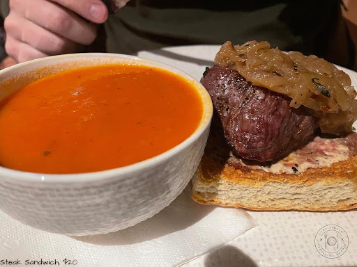 Next, my boyfriend ordered a steak sandwich with tomato soup as a side š . His was also a itās good but not at the same time. The steak was more rare than medium rare (not sure if the picture reflects that well) but it was very bloody after one poke. He didnāt send it back since he can tolerate a bit more bloodyness but not me š«£ flavour-wise he enjoyed it tho. As for the soup, he enjoyed it! He likes tomato-based soups so itās a recommended for him (but wouldāve been better if it came with crackers).