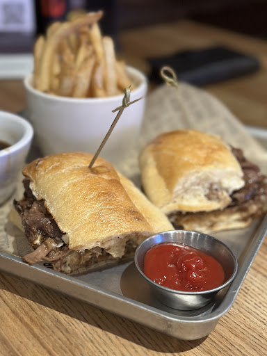 Nice atmosphere with fast and friendly service. And the place was busy before a Rush game. I had the burger which was a pizza burger and he had the roast beef dip. The pizza burger was nice and savory and had the combination taste of a juicy burger and pizza. It was made of house pizza sauce, mayonnaise, arugula, mozzarella, and pepperoni on a toasted potato bun. And the roast beef dip had tender meet and a soft, buttery toasted baguette. I enjoyed both and could see returning for another sporting event.
