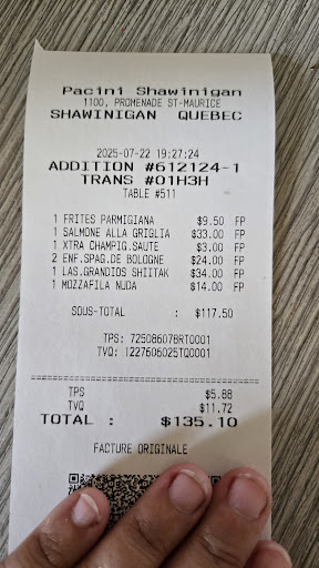 Commentaire initial. Difficile de donner une note. Je vais quelquefois manger dans ce Pacini. Certains aspects sont meilleurs qu'au Pacini de Trois-Rivières mais d'autres sont pires.
