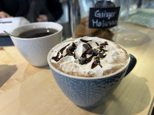 We stopped off here for a coffee, hot chocolate and muffin on a Saturday afternoon. The hot chocolate was made with so much attention, the cream, sauce, Sprinkles was amazing and beyond what we were expecting. Although we only stopped for a drink and a place to stop, we took a photo of the menu and will be back for paninis, and also will bring friends and family there when we visit the area again. A gem! Bathroom was large...