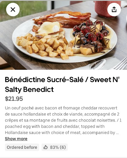 Pendant que moi et ma copine mangeons mes crêpes (qui avaient déja été retardées dû à une erreur), nous nous rendons compte qu'une autre erreur a été fait dans mon plat : une des trois crêpes ne contient pas ce qu'elle est supposée contenir! Mon plat est supposé être constitué d'une crêpe épinard-cheddar, une crêpe jambon-suisse et une crêpe cheddar-bacon. Or cette dernière est manquante et je me retrouve avec une crêpe fromage-pomme à sa place (j'ai commandé ce plat parce que j'aime les déjeunner salés). Nous retournons donc la crêpe intrue et la serveuse s'excuse encore ; nous lui disons que ça va, bien qu'on commence à fatigué de jouer à l'assiette musicale.
