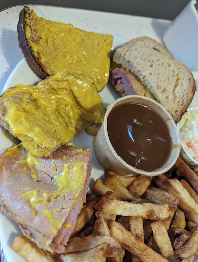 Read morePlus de moutarde que de viande dans le pain. Smoked meat servi sur du pain ordinaire brun? Sauce et frites froides. Pas de cornichon. J'ai retourné mon assiette et je n'en ai pas redemandé d autres tellement ça m'a levé le coeur. C'était ultra long. Un autre client a retourné son assiette et un autre est reparti tellement c'était long. Dommage car le décor est cool et les commentaires étaient bons mais c'est sur qu'on ne retourne pas la. Heureusement que les serveuses étaient sympathiques et ne m ont pas rien chargé. Elles faisaient...
