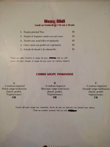 Read moreLa serveuse est seule pour servir tout le restaurant, alors elle court littéralement. 5 secondes pour prendre la commande, et hop! la revoilà partie. Pas le temps pour des questions. Elle court pour aller vite, mais en allant vite, elle oublie des choses... La soupe (entrée) est arrivée presqu'en même temps que le chow mein (plus nouilles croustillantes - nid d'abeille que chow mein tant quant à moi). Pour l'accompagnement de fèves germées et lime qui va avec la soupe tonkinoise, j'au dû me lever et aller demander parce qu'elle avait complètement oublié. Ça c'est le service... Nourriture : la soupe crevettes, lait de coco en entrée avait bon goût mais les nouilles trop nombreuses et restées trop longtemps dans le chaudron gonflent et ne donnent pas une texture agréable en bouche. Le chow mein au poulet était bon, et mention spéciale pour le poulet qui n'avait pas le goût "bouillie" comme dans la plupart des plats asiatiques au poulet. La soupe tonkinoise au poulet était très bonne en ajoutant sauce et condiments. Nourriture ok, service...