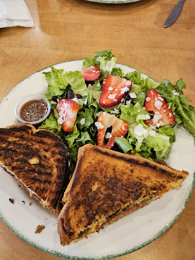 Read moreMy Mom and I went there for lunch on May 4th. As we were standing in the entrance to be seated we were greated by a young man with blonde curly hair, looking very unimpressed. We asked if we could have a booth, to which he replied "I guess I can go clean one"... and let out a long sighhh as he grabbed a cloth and walked to the table. While we were waiting and he was wiping the table, a friendly young lady proceeded to seat us. After some debate on the menu, I ordered a grilled pizza sandwich & my Mom a tuna melt. We asked for salads as sides and when we asked what dressings were available, we're told " only balsamic, that's it.. :(. Not everyone likes balsamic dressing, so don't understand why they don't have at least 2 options to choose from. Sandwiches came pretty quick...side salads had nice presentation with sliced strawberries and coconut sprinkles, however, the lettuce was terrible...definitely not fresh, dry and limp pieces throughout. My pizza grilled sandwich looked quite burnt, I decided to take a bite out of it and sure enough the whole sandwich was ruined and tasted bitter, as you can see in the picture it was VERY well done. The waitress never came by and asked us how everything was, so eventually I was able to track her down while she passed our table and mentioned that the sandwich tasted burnt, to which she replied " I guess it does look burnt doesn't it"?!! Personally, I don't even know why a waitress would serve this to someone. I decided to have a tuna melt as well, and that was brought out quickly. Extra napkins were scare, besides the one that wrapped the utensils, we asked for more but they never came, so we used the ones under the teapot. The waitress never asked if my mom wanted a water refill for her tea, at one point she actually walked by with a coffee pot and said "oh never mind you're drinking tea not coffee", and just proceeded to keep walking quickly, we didn't even get a chance to ask for more water..... I also did witness the boy, with the scraggly blonde curly hair, running his hands through his hair on several occasions while answering the phone and walking around and then bringing plates of food out to tables, which I found very unsanitary, as I'm sure he doesn't wash his hands every time he runs them through his hair and delivers food. All in all we were very disappointed for our lunch, especially for what we paid and will definitely NOT be RETURNING to this establishment. We actually came here when it first opened and it was fantastic, not sure what's going on now, but somebody needs to tighten up the reins. UNFORTUNATELY, we won't recommend this place, especially...