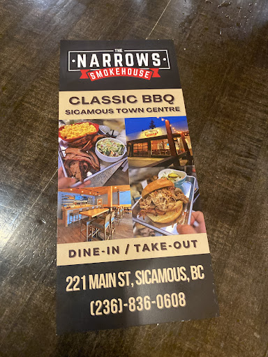 Read moreWe had not been in Sicamous in years and decided to stay on our way to the coast. We were pleasantly surprised to find the Narrows Smokehouse. It was a chilly rainy day where we were greeted by Doug, the owner. There were three full tables, a couple out on the deck ( who moved inside when the rain picked up) and Doug says pick whatever table you want. The garage type door which might be a little chilly or the cozy table in the corner near the bar. We chose the later; best decision ever. Doug asked us what did we want to drink tea, coffee a nice cocktail? We chose the later. The tiny bubbly waitress, Marina, comes and asks do we want to eat! Yes, my husband orders the watermelon salad which he said it was better than the one I make. Hubby had a beer and I had the lavender spritzer, OMG it was presented with a small tiny clothespin holding lavender in the cocktail. I ordered the brisket and the cornmeal muffin with honey butter, oh my that muffin was perfect with excellent honey butter. Words can’t describe how Devine it all was. I tried to get my hubby to try brisket to which he finally did. It melted in our mouths with our choice of five homemade sauces I highly recommend the mustard with the brisket. During all this with the restaurant occupancy low at that moment Doug, Marina (yes I spelt that right) and us chatting. I want to take a pic of my exquisite drink when I realize my cell battery is dead! No worries they say we’ll charge it for you, bonus! I finish my drink kinda quickly but it was so good. Marina asks would you like another drink? To which I said I want to try the raspberry cocktail. Doug presents this drink with pride. OMG another hit with freeze dried raspberries floating in the white foam. That drink went down pretty easy. This restaurant deserves all stars I have given it you will not be disappointed. The lavender spritzer was so good I had another and took pics with my cell now charged. We will be back but watch they are not open on Mondays. Oh and I didn’t want to waste the lavender so crumbled it up and threw it in my purse. When Doug saw this he brought over to me a delicate skeleton leaf and explained he puts these in a drink too. I was afraid to touch it it looked so delicate. He said put that in your purse it has the properties that will make it scent your purse as well. Oh I almost forgot my hubby had a margarita (not the slushy but the kind over ice) which he said was the best ever and he makes...