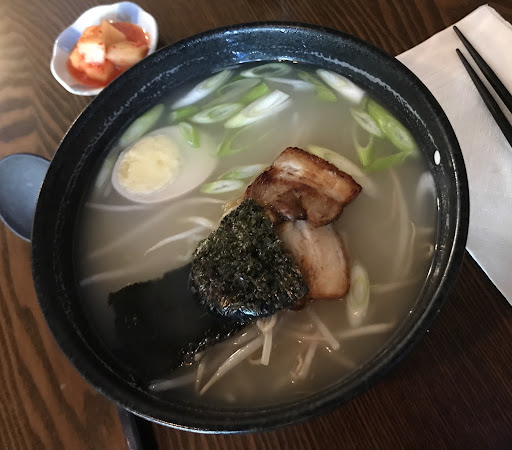 Our second visit was to see what kind of soups were on the menu. We expected to see Udon, which we did, but I was extremely happy to see tonkotsu ramen. My partner chose an item from one of the few Korean items to select from. She had a vegetarian Korean soup which was served with rice and kimchi. The ramen was very good. Rich broth but without too much salt, nice cutlets of pork belly, hard boiled egg, and nori. The noodles were firm but tender. The broth silky smooth. The Korean soup was spicy and full of tofu and vegetables as well as a poached egg. We were both reminded how delicious the food is there. The wait person might have been one of the owners. She was very polite and friendly even as, again, we pushed the closing time.