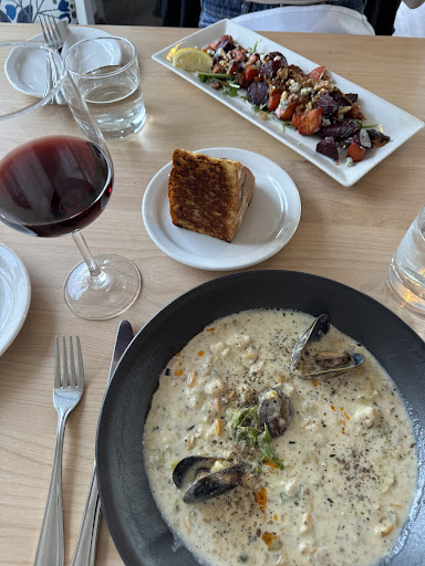 I really wanted to love this restaurant but was sadly quite disappointed. The setting is lovely, especially if you can get on the patio to enjoy the lovely views overlooking the water. We had a reservation for indoors as the patio is first come only, which was probably a good thing as the evenings cool off quickly (they do have heaters on the patio). For starters, the room was very busy, & the layout did nothing to disguise that- set up a bit like a family restaurant with booths all around the perimeter & tables in the middle. I probably wouldn’t normally notice that but I’m still trying to figure out why we found the room so nonplussing. The other knock is that the room is very loud - there didn’t seem to be any consideration of acoustics, so we had to talk loudly between ourselves & could hear clanging, crying kids, & loud customers echoing from all areas of the room. A few acoustic panels strategically placed would make a huge difference I’m sure. Our server was pleasant enough, but rushed (busy I’m sure, but some servers are more clever at not conveying that onto their diners. We had the feeling we would be seriously inconveniencing our server if we asked for anything slightly out of the ordinary - I’m not a fan of clams, and asked if it would be possible to only have mussels instead of the menu’s offering of steamed mussels & clams, and was curtly told that everything was pre-weighed & it would be an extra charge to do that- not sure if mussels cost more than clams - I would’ve paid the extra, but just seemed like too much of a hassle). All of these things are fairly easily overlooked by good food, but none of our dishes were really outstanding. They were fine, but no delicate flavouring. I had halibut, which was slightly overdone, and there wasn’t any real connection between the breaded artichoke pieces, olives, potatoes & stewed tomatoes, except maybe just a Spanish theme. The tomato bisque looked lovely but was fairly bland & not hot. The mushroom ravioli was swimming in a cream sauce. I had wanted a glass of red, but found the wines by the glass were not very interesting & not worth spending the extra money on. Our overall impression was that it wasn’t a fine dining experience as we’d hoped - everything was okay, but not memorable. I think it would be a fantastic brunch space or more...