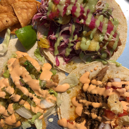 Taco 1 - Shrimp - iceberg + verde, pickles jalapeños and chipotle crema on a flour tortilla Taco 2 - Pork - pico + chicharrón and chipotle crema Taco 3 - Fish - slaw + pina, pickled onion, avocado crema