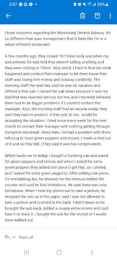 Ā Ā Ā Read moreStopped in at the Subway in Morrisburg and had a great experience. The staff were friendly, quick, and made the sandwiches exactly how I asked. Everything was fresh, the restaurant was clean, and service was excellent. I would like to specially add that I had someone who was pure vegetarian and didnāt even eat eggs. When we informed the staff that we are ordering a vegetarian sandwich, they washed their hands again, put on fresh new gloves and also had a special separate color coded (green) knife to cut the sandwiches. I believe this is extremely helpful for vegetarian and vegan customers. Convenient location mins from highway 401 ā perfect for a quick stop. One of the better Subways...