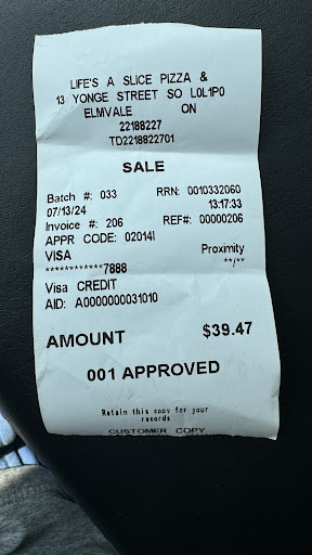 Read moreWe've always ordered B2's pizza in Elmvale but they were a 40 minute wait the other night so we decided to try Life's A Slice and man oh man were we happy we did! Let me preface this with B2's pizza is Great, but after having Life's A Slice they're going to be our new go to...top of the pizza was done and crispy as well of the bottom was crisp(not burnt but done perfectly) we had the cheesey garlic fingers with it which were delicious although a bit strong on the italian spice and garlic but still very good. Going to try the same as before but add a caesar...