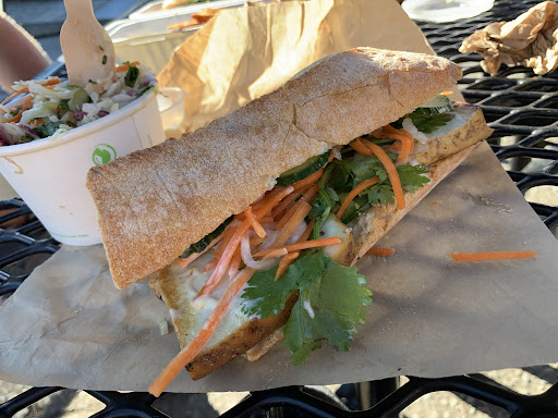 This time we got the salmon burger and Tofu Bahn Mi sandwich and salmon burger. Bahn Mi had nice smoked tofu but as others have mentioned it was good but not fantastic. The salmon burger was the same - good but not mind-blowing or anything for the price. Prices included a side. The wedges with garlic aioli were awesome but the slaw was not. It wasn’t vinegar-y or creamy, it was kinda tasteless, just like the chopped veggies.