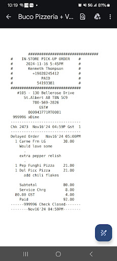 Wow!!! I usually don't care waiting a little longer but... 2 different drivers, and almost 1 hour and 1/2 for a very cold pizza and a salad, from this restaurant, which is 5 minutes of driving from our place. The 3 stars is for the taste, but I had to reheat the whole thing. Guys, really, I understand that it is a Friday night, but this should have been planned better maybe? At least, call the customer to inform them about the situation or maybe offer a discount or something to compensate? Even an appology would have shown a minimum of respect on your end at least. Restaurants should stop treating delivery orders like they are such an inconvenience and neglecting the quality of service for these orders. (Or offer your own delivery service if it's financially better on your end?) I understand that an online order doesn't bring the same value to your business, as I have been working in the food and customer service industry for 25 years, but there is actual good reasons why some people can't make it in person sometimes (No access to vehicle, disabilities, injury, etc...) It still affects your image anyway in the 1st place, and you still get money from these orders too! (We pay so much extra money to get it delivered.) We used to LOVE Buco, but I'll have to admit that the past few times we ate there in person or that we ordered online were really disappointing. Even the staff didn't looked happy. I'm also not the only person mentioning this, I've heard it from quite a few people. I hope that you are sincerely receptive to people's experience when they take the time to offer constructive feedback, and work on improving what's wrong without treating your staff any different. (Unfortunately, some...