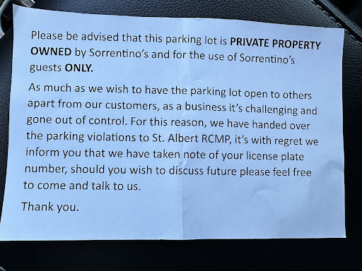 Read moreWill never be dining at this establishment, clearly run by someone with no morals. Had an ultrasound booked at the MIC Diagnostic Imaging Center that is right beside this establishment. It's blizzarding and cold, and after circling the MIC parking lot numerous times and waiting for a parking spot to free up I had no luck. I had my 1 year old baby with me and noticed that the Sorrentinos parking lot was COMPLETELY EMPTY, literally not one single vehicle in sight at around 2:45pm, so I decided to park there as I was going to be late for my appointment if I kept circling the parking lot aimlessly. I was in MIC for maybe 30 minutes tops, and came out to a nasty note from the staff at Sorrentinos that they had called a tow truck and our license plate had been recorded because we were "parked illegally" in their barren empty parking lot. So needless to say I crumpled up their little note and threw it on the ground in their trash little parking lot where it belongs. I would understand this note if they actually had business and there was nowhere else for their paying customers to park... but when I say there was nobody there i mean absolutely nobody. The front main parking lot was completely empty as well as the side parking lot, and the back parking lot was empty too aside from the few vehicles parked in it which I'm assuming were all staff. Completely unnecessary to leave a nasty note like that, I'm sorry your bitter about your empty parking lot. Maybe if you had a better attitude and focused on your business instead of who's "illegally parking" in your parking lot you would actually have some customers to fill it. I know I sure as heck won't be one of...