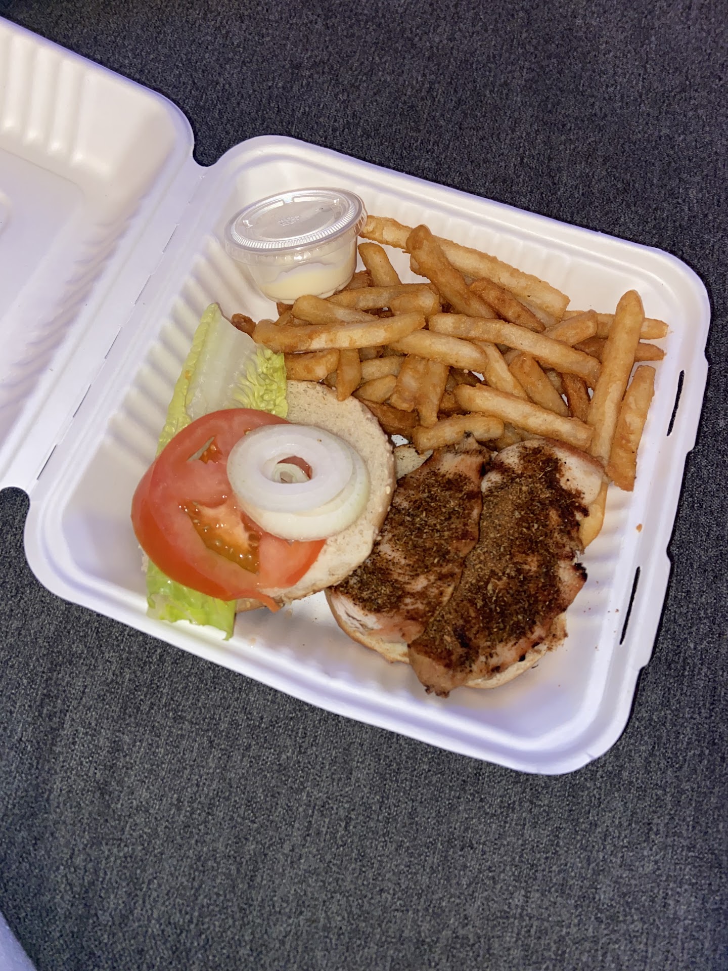 The food, however, was terrible. My Cajun chicken sandwich had 1 piece of lettuce (didn’t even cover half the bun), 1 tomato, and a couple rings of onions carelessly thrown on. The chicken was completely dry and cold, and it looks like the seasoning was forgotten and put on later. It was the worst chicken sandwich I’ve ever had.