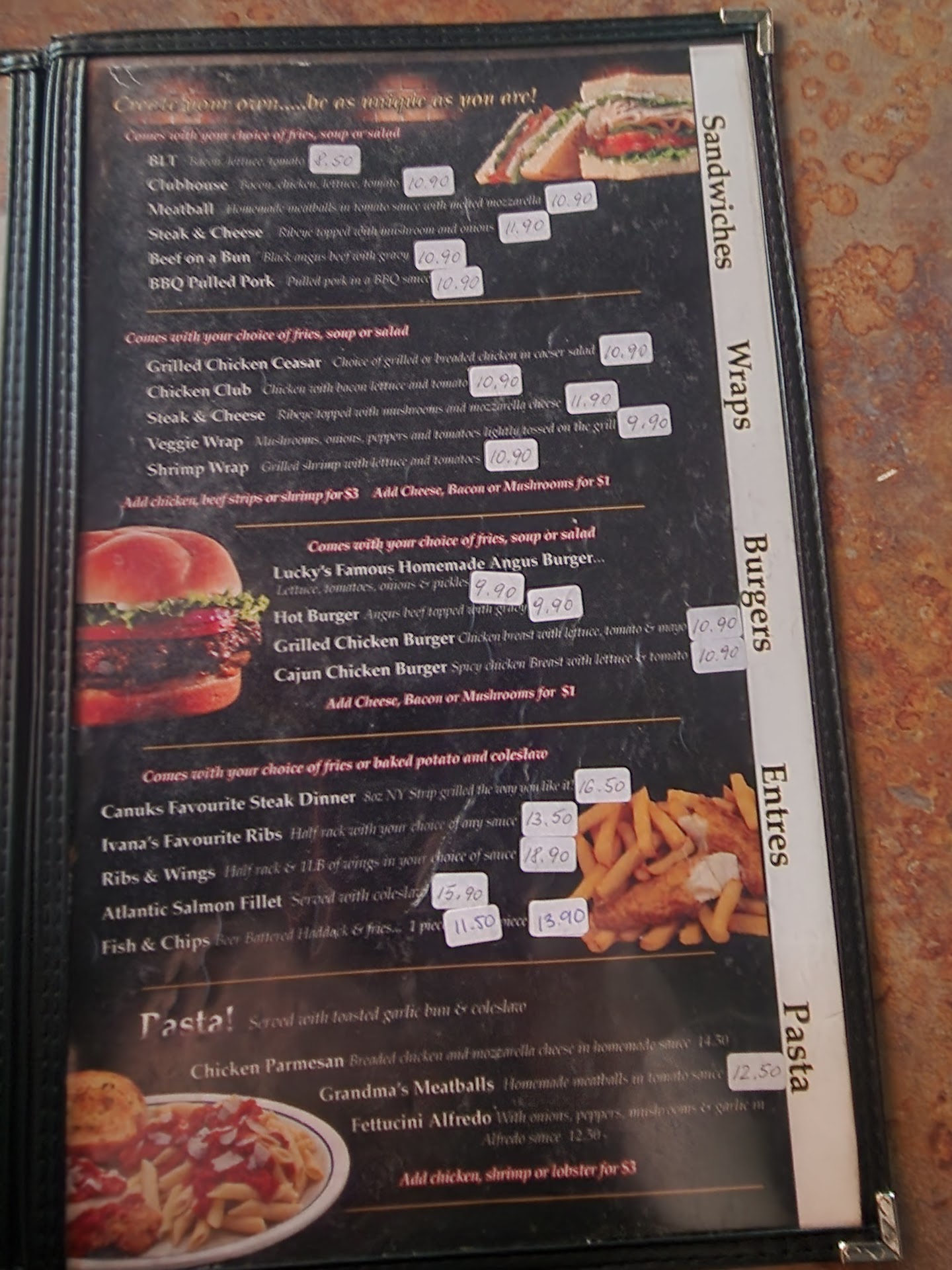 Food was mostly OK but the first two drinks we asked for (from the menu) she said they didn't have and when we asked for bottled root beer, as displayed on the menu, she said Pepsi doesn't make root beer. Pop was extremely watery like the machine was running low on syrup. I mentioned it to my server and she just blew it off as being diet. I know what it's supposed to taste like and it's not because it was diet. The hot chocolate was also very thin. The server said it just comes from a package and she adds water. Maybe for a large cup like these, you need two packets? We attempted to address our concerns about the difference between availability and menu but all we got were excuses from the server. If you don't sell enough chocolate milk to justify offering it, take it off the menu. The mozzarella sticks were good, the Lucky Angus was good, the chicken Caesar wrap was good and the fries were OK but the "award winning" chilli didn't look anything like the picture on the menu, and it tasted like it was made with hamburger helper beef stroganoff as the base. Very disappointing. In light of all this, we opted to skip dessert because when the chili you get from a fast food joint like Tim Hortons or Wendy's is better than the more expensive chilli from a sit-down restaurant, there's a problem. I probably...