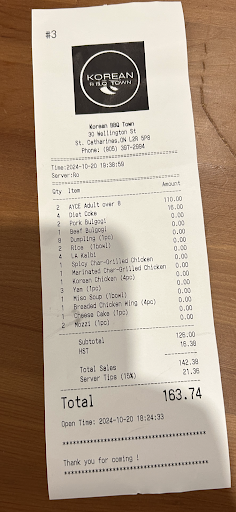 For this meal at korean bbq town, I wouldn't mind paying $5 for those few pieces, but $15 is definitely too much. On top of that, they were the ones who control the amount of meat that we received. But that was their policy, so we still ended up paying. What happened next was what concerned us the most.