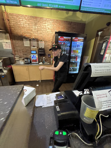 The young woman that served us struggled to open our pitas and ripped my girlfriends to shreds but still continued making the pita, I even made a comment to her that there is no way that is going to roll. Sure enough when she finished packing the pita and attempted to roll , it broke at every seem. She then transferred the petita into a regular sized pita and did not remove the extra bread, so my girlfriend then was biting into a 4 layered bread pita when it was time to eat. You could see the look on other customers faces about their experiences as well. The quiet atmosphere also made it an uncomfortable visit when your used to much more of a welcoming...