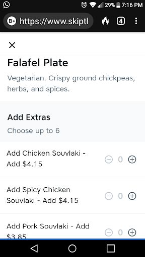 My boyfriend and I placed a Skip order two weeks ago. We both got falafel plates, and under one I special requested that anything that wasn't vegan was to be left off. Fortunately for me, a very polite worker called to let me know that the potatoes and rice are made with a chicken base, and she offered adequate substitutions. However, this makes it not even vegetarian. It's upsetting because I've eaten here before, the restaurant was even recommended to me by a long time vegetarian.