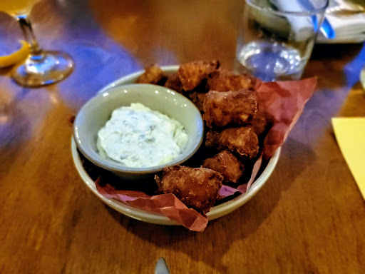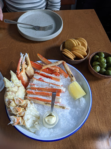 We just had a very special culinary experience at Portage. If you are into fine dining this is a must try in St. John's. Even if you aren't into "fine dining" , Portage strikes the right kind of notes making it a bit on the more casual side. It isn't just tiny faffy dishes like some fine dining places are. My wife and I went with the intention of ordering and trying a bunch of different dishes and so I will give feedback on them all. We had: smoked olives, rutabega as our vegetable, our proteins were the crab and the steak and for dessert we had the lemon custard loaf/cake. I'll start with the drinks though. We had a quick conversation with who I assume was the sommelier - I assume that because he was very very knowledgeable. I learned a lot about wine - and my wine order was very very good based on the recommendations of staff here. The smoked olives were the best olives we've ever eaten - the smokey flavor was perfect to get our palettes ready for the main dishes. Next the crab came. I believe it was a full crab that had been appropriately broken down so that you don't need a shell cracker - easy to handle. Of course the crab was incredibly fresh. The crab is served with a simple and creative accompaniment - salty Ritz crackers, lemon, and I believe a lemon mayo. The intention is for you to put the crab with a little bit of the lemon mayo onto the cracker and eat it. It was very very good - with crab as fresh as what you get here you don't want to mess with it too much you just let the freshness speak for itself and this is a good use of that. Ritz gives the saltiness, citrus is there. Loved it. The next dish was perhaps my favorite - the rutabega (partly eaten in the pic - sorry, it looked too good to wait!). It isn't necessarily the dish that I would have usually ordered, but we wanted to try something different. It was absolutely incredible. It had this amazing sauce full of citrus and fresh herb flavor - it's a massive flavor explosion that is difficult to describe. But don't sleep on the vegetable dishes here. This was my favorite dish. My wife's favorite dish was the steak. This was definitely one of the best steaks we've ever had and it comes with these delicious potatoes. Please note that in my picture the steak was already kind of half eaten - I had already begun before I realized I should take a picture. The cook was medium rare, exactly as ordered. The sear on the outside of the meat was perfect - you just don't get a strong sear like this from steaks at other places like The Keg. This was a serious professional sear. It was served with a green peppercorn sauce that added the perfect amount of heat and moisture to the dish. Amazing steak dish. Finally, we had the lemon cake dessert (I forget the exact name of the dish). It was a loaf or cake with a lemon custard on it topped with partridge berries. A perfect tart end to a beautiful dinner.