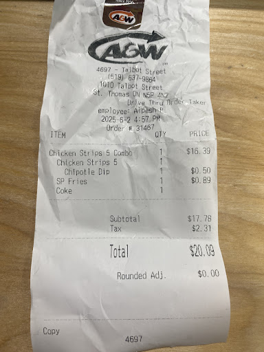 CHECK YOUR ORDER BEFORE YOU LEAVE!!!! We went through the drive thru to order dinner for our family. The cashier was Jeanette. We ordered Burgers, Fries, Onion Rings, Drinks. 2 of the burgers were Beyond, and 2 of them were Papa burgers. We made sure to state that one of the burgers needed to be plain. We ordered 4 fries, 2 onion ring, 2 drinks. After every pause the cashier said "is that it". We felt extremely rushed. When we got home, we were missing 2 fries and one of the burgers had condiments on it. We distinctively remember ordering without condiments (picky eater). I called A&W in St. Thomas to let the person know and she started arguing with me about what we ordered. She insisted the burger was ordered with toppings and there were only 2 fries on the order. I told her I know what we ordered and we were shorted. She kept on arguing. I didn't feel like this was getting me anywhere, so I contacted head office. It is now 4 weeks later, and I still haven't gotten a response. I would have been okay with an apology and a proper made burger since we are all human and do make mistakes.