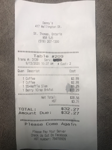 My partner and I went to Denny's in St. Thomas for breakfast on Sunday Sep 13/20. There was a line-up and we left our phone number and were told they'd call us when a table opened up. No problems. We waited but never got a call so we went back in and gave our name and they had to look back on the previous sheet to find us. In other words, they skipped over us.