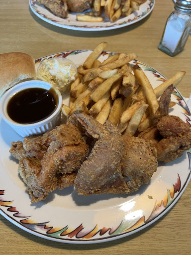 We had heard that the fried chicken was really good here so we were excited to try it. We ordered the 3 piece fried chicken special x2. I specifically asked before ordering if I could get all white meat and was told that it shouldnât be a problem; but after putting through the order the waitress came back to our table and told us there would be an up charge on my chicken unless my partner had all dark meat. They made such a big deal about me getting white meat and brought me out 2 itty bitty wings as white meat? The wings were bloody and the bones were broken, they were so small with hardly any meat. My other piece was white meat but the meat was non existent as well. The chicken was so hard and dry because every last ounce of moisture was fried out of it due being way overcooked. My partner had 2 itty bitty drums and one other piece of dark meat. Long gone are the days that 3 pieces of chicken would fill you up because this particular plate was devoid of chicken. The fries made up most of the plate of food and they were skin on, dirt encrusted, rotten blackened ends. Not appetizing in the least. The only redeemable thing on the plate was the small ramekin of gravy⌠but one can hardly make a meal out of gravy alone.