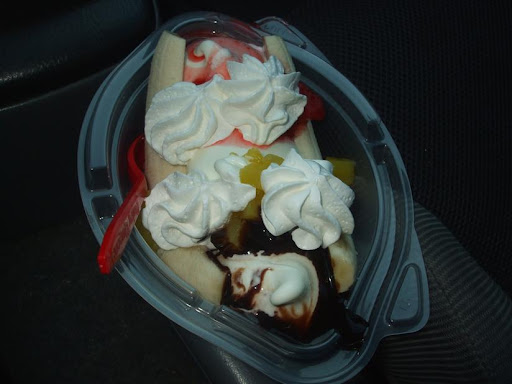 Anyhow, I thought I would treat myself to something more elaborate: a banana split. Today (08 July 2024), I paid $7.90 (all-in) for this scrumptious treat with that incredibly thick and creamy quality that seems to stay very consistent over the decades. (Certainly, they sometimes have a bad day when the machine refuses to make the typical thick creamy consistency.)