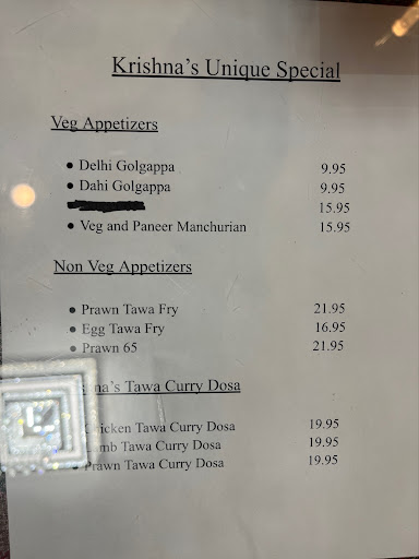 Read moreI discovered this place last year. My first visit here was for a brunch. Honestly, did not expect it to be so wonderful. The food, interior, music, all of it felt like home. I went back within a week or so with some other friends, this time. Again, it was a treat for all the five senses. Gradually, I and my husband became regulars at this place. We got acquainted with Loki, who gave us an option to order the âLoki specialâ and we were thrilled. Itâs a different, unique kind of a meal thatâs not on the menu. He asks us questions like, what do you feel like eating, meat/vegetarian choices, etc. and whips up magic on the plate. This gesture was just too heartwarming. He makes our rasam extra strong in case we go there with sore throats. I had to come in here and write this review as this place truly feels like home. Being an immigrant, feeling full in your heart with ghar ka khana doesnât happen everyday. But for me and my husband, we feel great to have found a home in Krishna Dosa and grill. Loki runs this place beautifully and serves everyone with love. Even though we donât speak the same language, our connection to this place is the one based on food. I enjoy my meal here while listening to some wonderful South Indian music, again something that I donât understand, but deeply enjoy. The aromas inside, the service, the thrill of a new dosa each time, the music, and the feeling of being insanely full by the end of it, reminds me of home. Thanks, Loki! Let the...