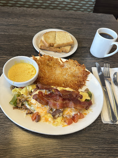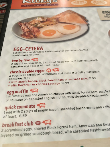 Read moreI've been to many Ricky's but this was only my second time at this one. I have only ever had breakfast at any of the Ricky's I've been to and today was no different. The menu is easily laid out and has just the right amount of classic options you expect at a place like this. I had the biggest classic breakfast they offer, it came with 3 eggs ( I had scrambled), bacon, sausages, hashbrowns, toast and, wait for it....pancakes! Literally too much food but an impressive spread. The eggs were cooked well, the bacon wasn't too fatty and was thick cut and wider than the usual rasher but i think it was deep fried rather than cooked onbthe flat top. The sausages were tasty and bigger and spicier than your standard english breakfast link. Ibdidn't care for the hash browns as they were the little triangle shaped pieces and were tossed with peppers and onions. I like shredded and i like them on the flat top. The multi grain toast was good, not too toasty and not toasty enough...know what I mean? The pancakes were bigger than I expected given they were essentially a side but they were a little chewy. The coffee was your standard diner coffee and our server kept it topped up which i really appreciate. All in all, a place to get a well prepared and tasty...