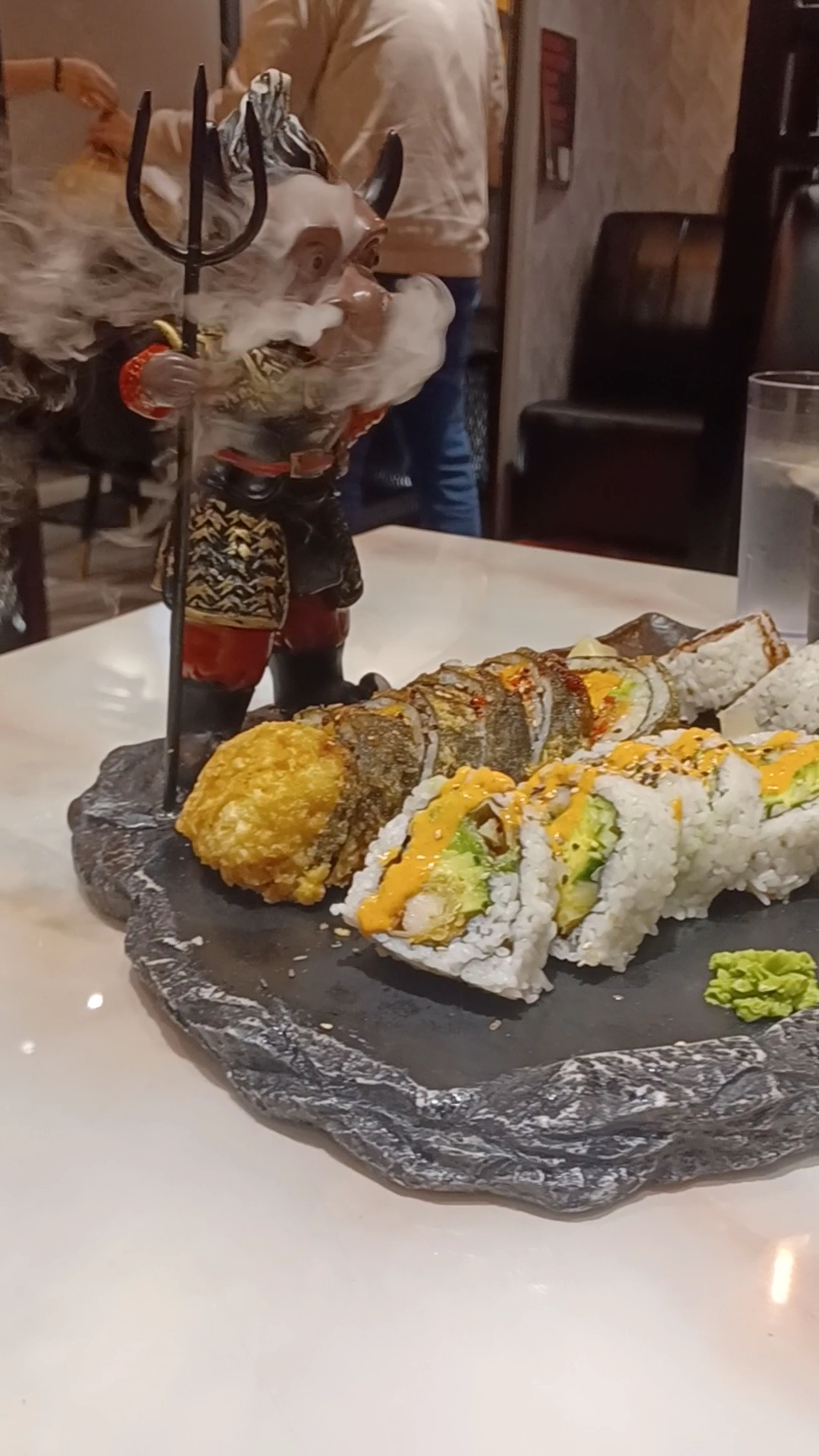 Overall, I say it was a decent experience. Probably gonna have to visit again to update my review. The presentation here is pretty cool. My friend ordered a crunch combo (2 sushi rolls with deep-fried tempura batter on top (not actually deep fried rolls)) and it came with a cool plate. It was a Samurai Warrior where the top of his head could be taken off; was filled with dry ice and smoked (added water at the table). You could see the effect and the smoke you could feel. Pretty cool and a...