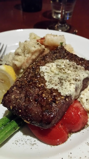 The live music stopped temporarily, and we could talk! Water refills finally arrive via another staff member, and boy did I need it. I want to point out, I ordered my steak rare because I like to be able to eat it and not have to gnaw on a well done piece of bootleather. Poor cut, I suppose, as I couldn't chew it anyways and needed to drink to wash it down. Both drinks are now empty for both of us, and there are no refills to be had. Eating the rest of that steak sucked. The mashed potatoes weren't completely mashed and were chunky, and frankly, kind of gross.