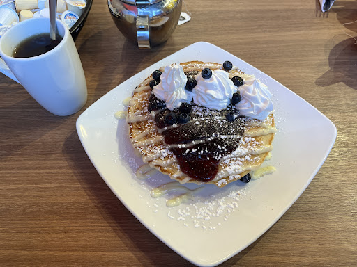 Iâve been twice and the first time the cafe mocha drink made me sick (Iâve had mocha before and didnât have this experience). This time I had tea instead and wasnât sick afterwards. I donât think they can legally call their whipped cream âwhipped creamâ as itâs very oily and more on par with cool whip. Pictured is the NY Blueberry Cheesecake stacked pancakes which are more blueberry pancakes than anything else as they donât add enough of the other toppings. I had the Biscoff Pancakes the previous time which I preferred. Itâs decent food, somewhat like the other trucker diners in the area. Donât get the home fried as they taste strange with whatever they cook them in.