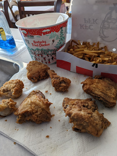 Read moreWell I had to post something.. my mistake was the wait 20 mintues for chicken. The seating area had 2 teenagers eating and playing on their cel rest of table were empty, 3 were dirty with food, there was pieces of chicken batter in several places on the floor, used napkin in middle of the floor..14 piece meal .. the sides were ok... the fried chicken was the most disgusting gross grease saturated chicken my wife and I have ever experienced . I had put the bag on the seat beside me and drove home. 1.5 hrs later ,I get open the passenger side door, picked up the bag and it was soaked with grease as was the seat...my wife loved kfc until today, she couldn't get through the 2nd pice of chicken...completely turned off from the grease saturated chicken... To me lol that's great because after this experience we will never waste another dime of hard earned money at...