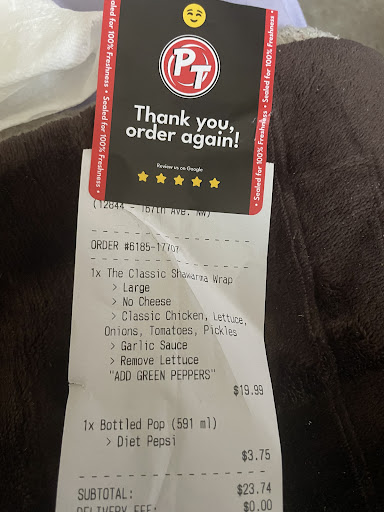 Read moreThis is the second time I bought a donair from this location this week. First time was ok, but the order wasn’t prepared the way I had asked and was charged for a large when I had ordered a regular size. This evening I was craving a donair and unfortunately I’m in the Northwest end of Edmonton for 2 weeks, so figured I would give another chance. BIG MISTAKE!!! The chicken was so dry, they shouldn’t be legally serving it, no sauce, and it just turned me right off. It was disgusting. I hate saying this publicly but this was not up to Prime time donair exceptions( my usual location in Heritage Valley in SW Edmonton is amazing every time) and it’s dangerous to be serving people bad meat,...